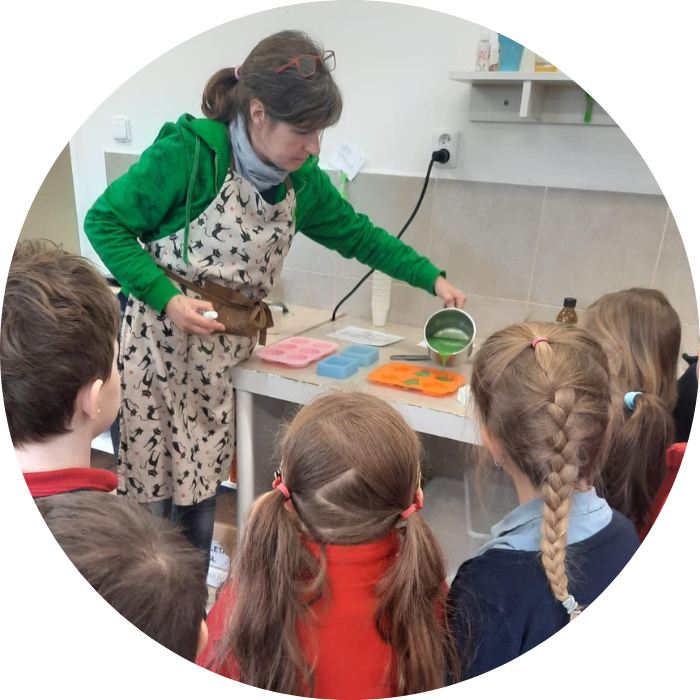 Uvítání, představení a prohlídka dílny DobroDíla. Ukázka, jak se vyrábí mýdlo (vaření a lití provádí naši mýdlaři), Mýdlový kvíz – poznej vůni mýdla. Následovat bude výroba/vykrájení mýdel dětmi. Čas na dotazy. Nákup dárků.