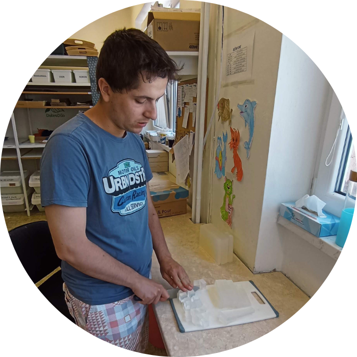 Tuto část výrobního procesu zajišťují v dílně většinou mýdlaři Václav nebo Michal. Jedná se totiž o velmi náročnou práci vyžadující hlavně sílu. Celý box surové mýdlové hmoty váží skoro 12 kg a manipulace s ní není vůbec jednoduchá. Krabice je nejprve nutné přepravit pomocí vozíku ze skladu do výrobny a poté jednotlivé bloky vybalit a hlavně nakrájet.