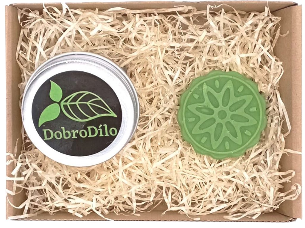 Krásná dárková sada, která obsahuje glycerinové mýdlo Aloe Vera a praktickou hliníkovou cestovní krabičku na mýdlo s logem DobroDíla.
