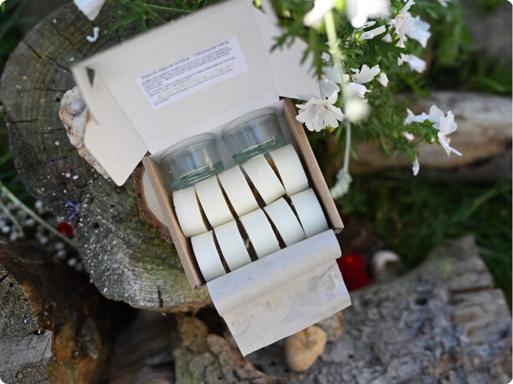 Čajová svíčka nemá vlastní obal. Před zapálením vložte do vhodné nádoby. Doporučujeme skleněné, keramické, či betonové svícny a kalíšky. Ideálně využijte svícnu dodaného v balení. V průběhu hoření se obal svíčky zahřívá, dbejte prosím bezpečnostních pokynů.