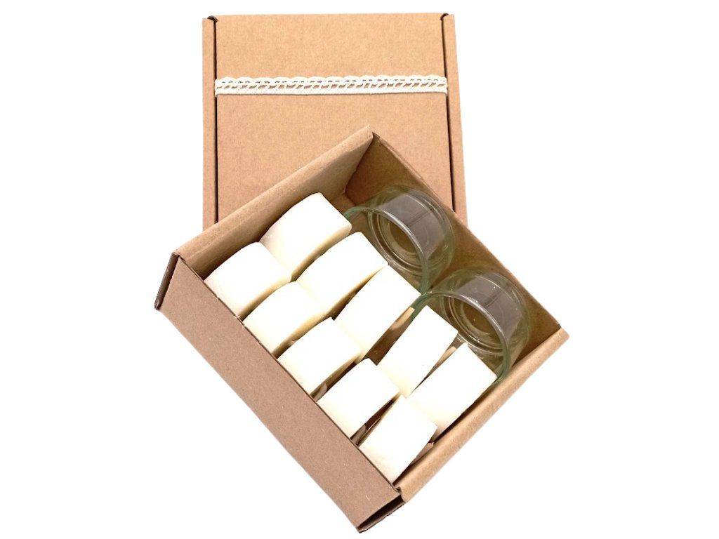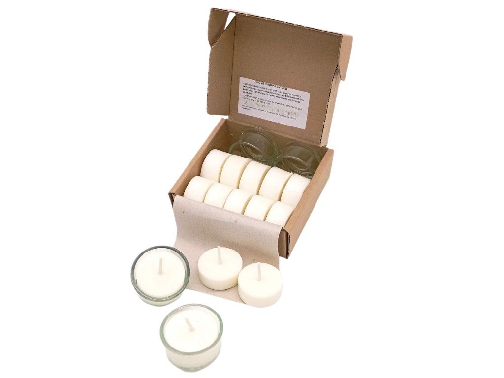 Čajové svíčky jsou bezobalové a jsou v sadě po deseti kusech se dvěma skleněnými svícny.